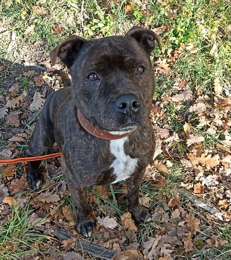 Helios est un croisé staffordshire bull terrier décatégorisé trÚs gentil, il est content et a hùte de chaque sortie.