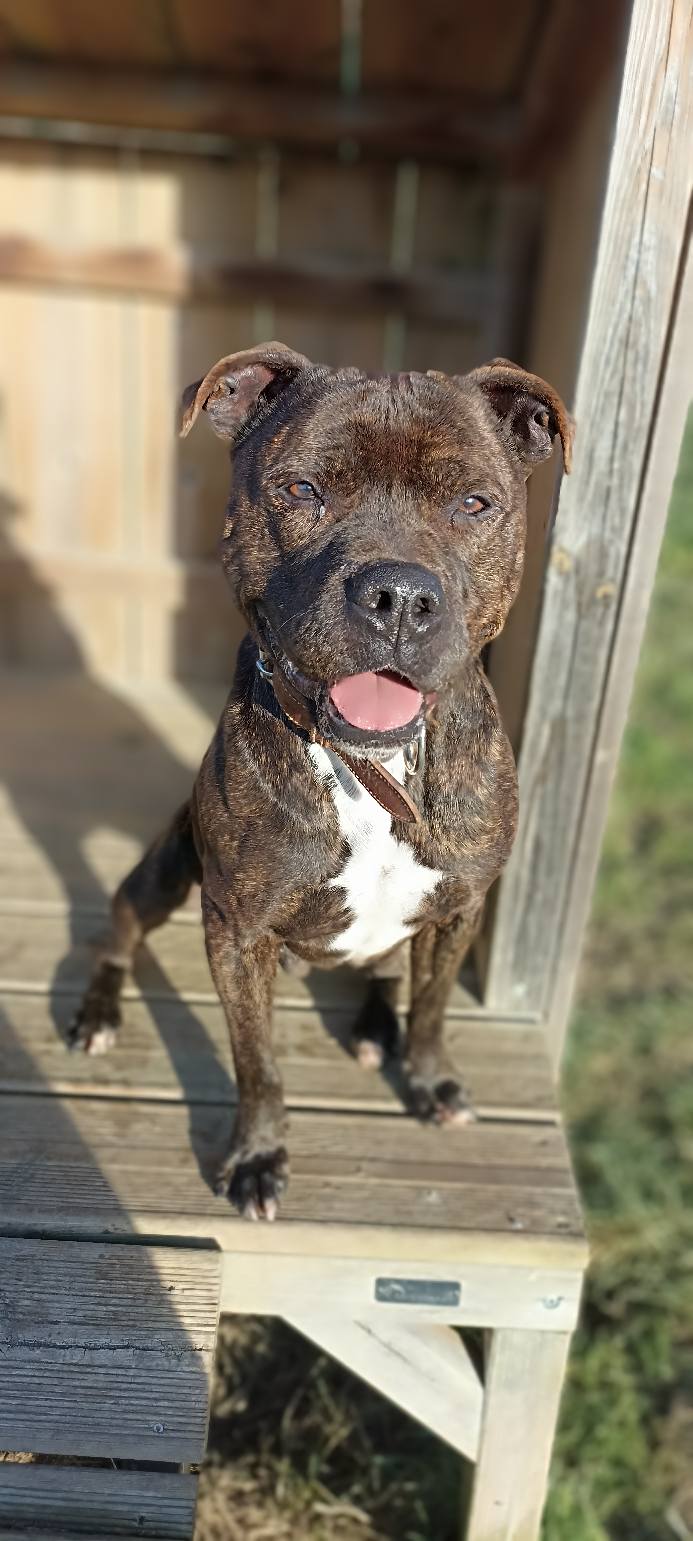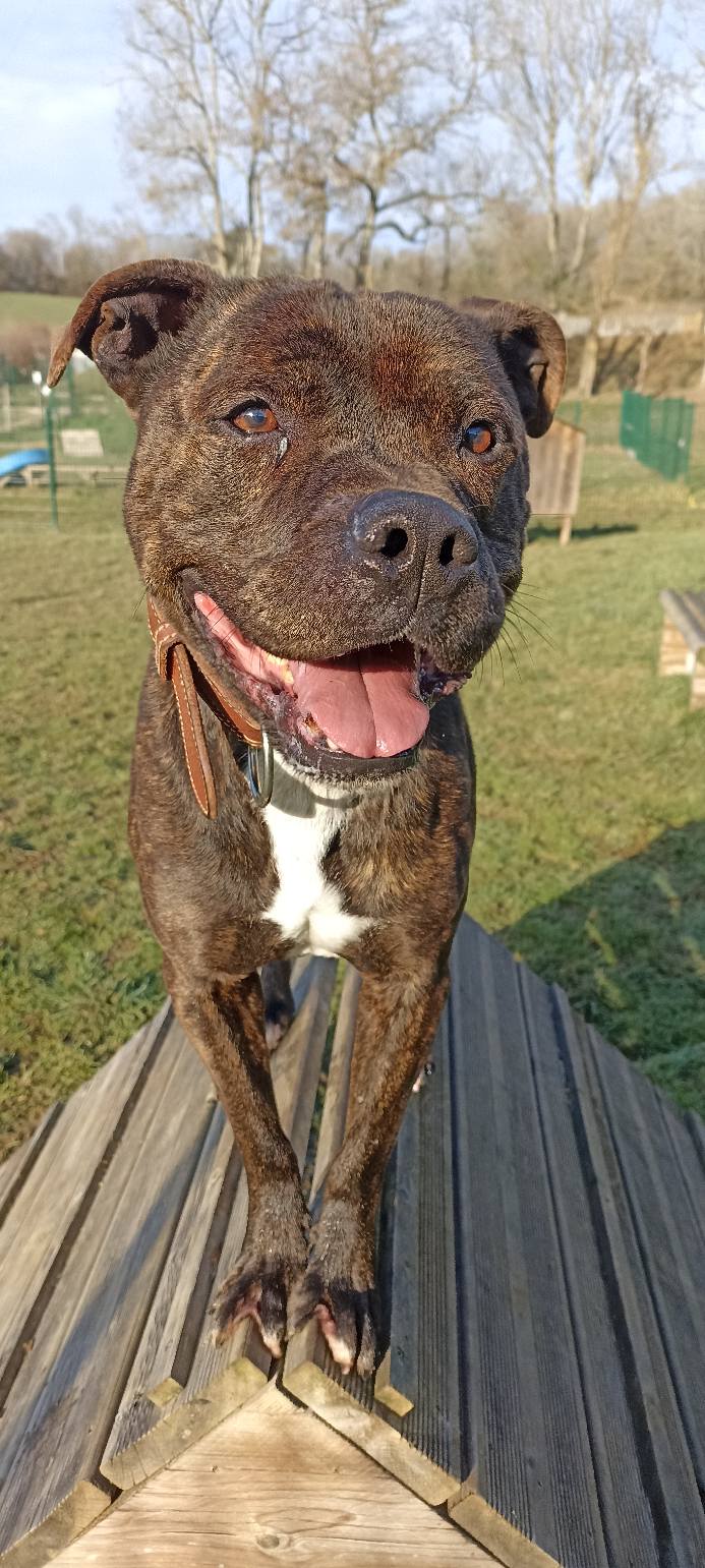 Comment vas tu ? Moi j’ai la pĂȘche, je suis HĂ©lios le croisĂ© staffordshire bull terrier, non catĂ©gorisĂ©, ĂągĂ© de 5 ans.