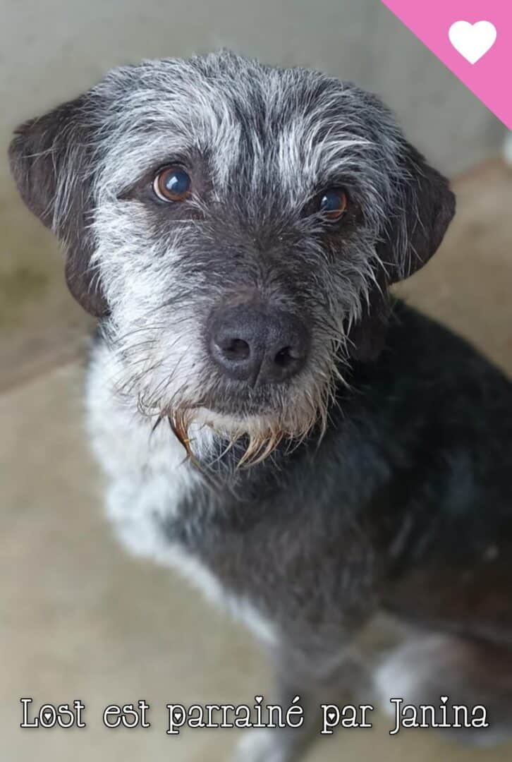 Lost est un croisé griffon timide, venant d’arriver l’environnement lui fait un peu peur surtout les bruits, il prend ses marques petit à petit.