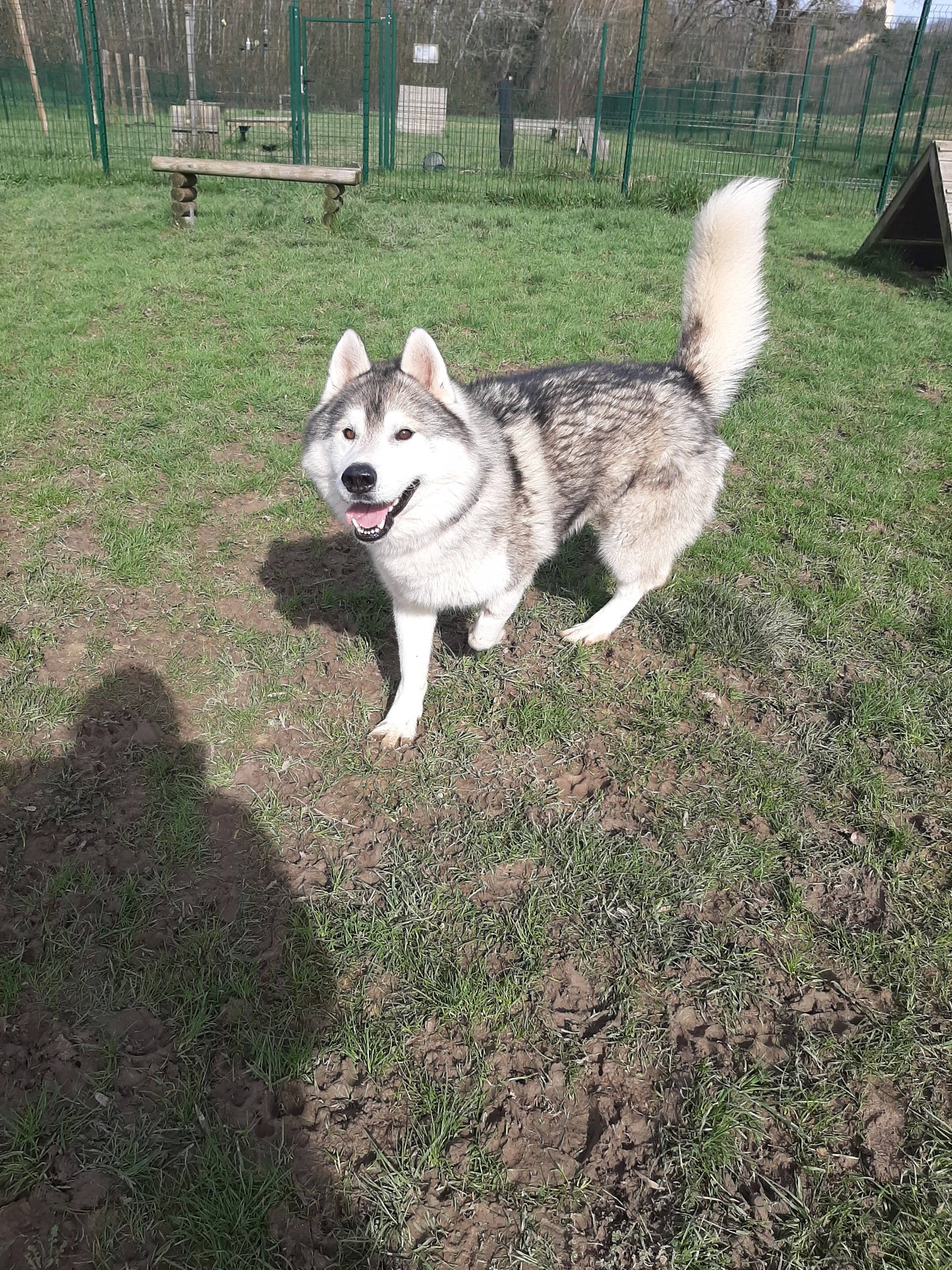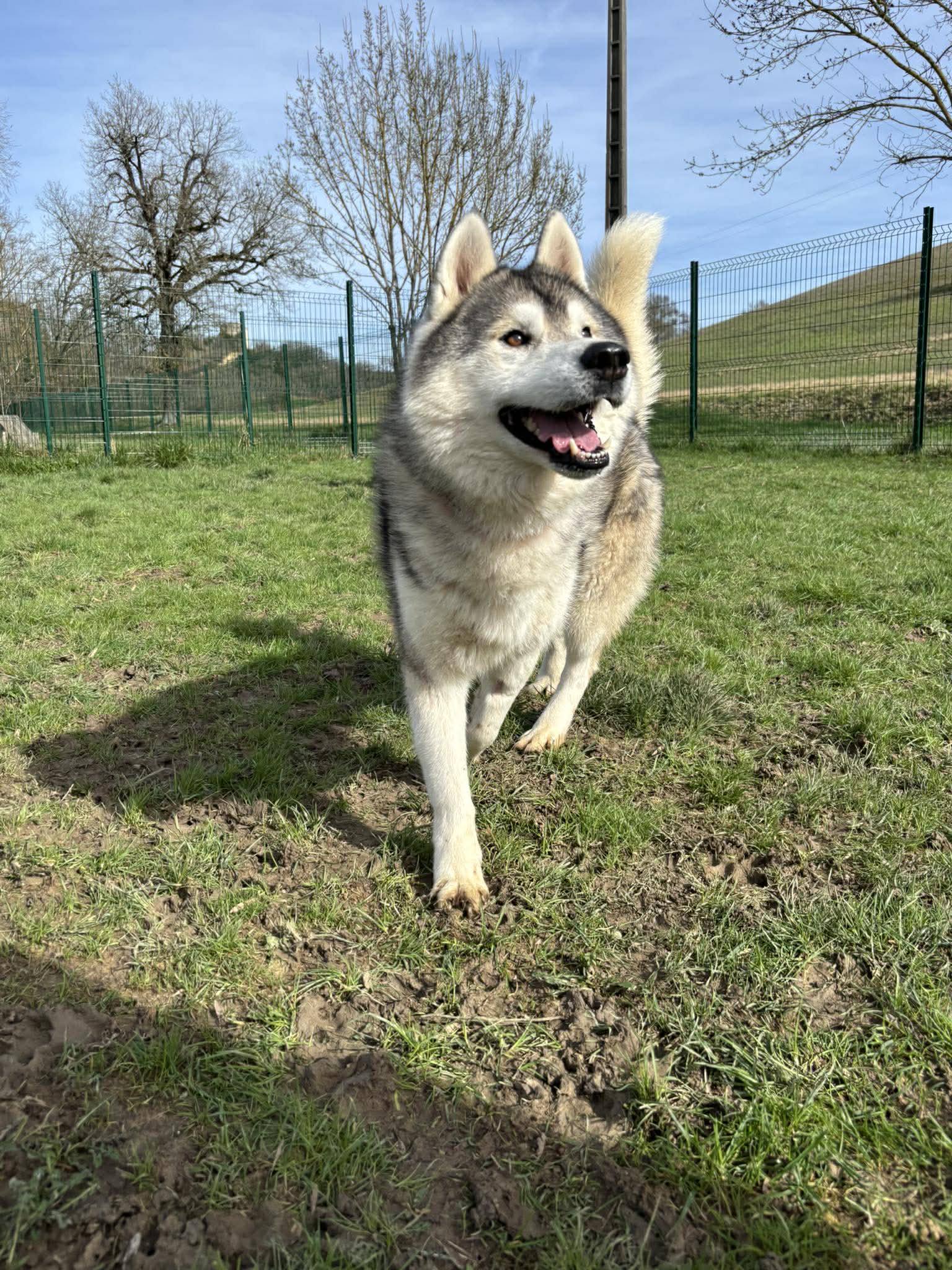 Oski est un husky gentil et proche de l’humain, il apprécie les caresses, il est câlin et gourmand.