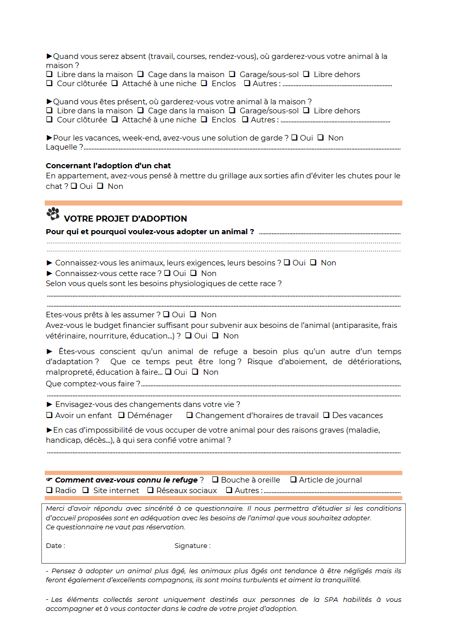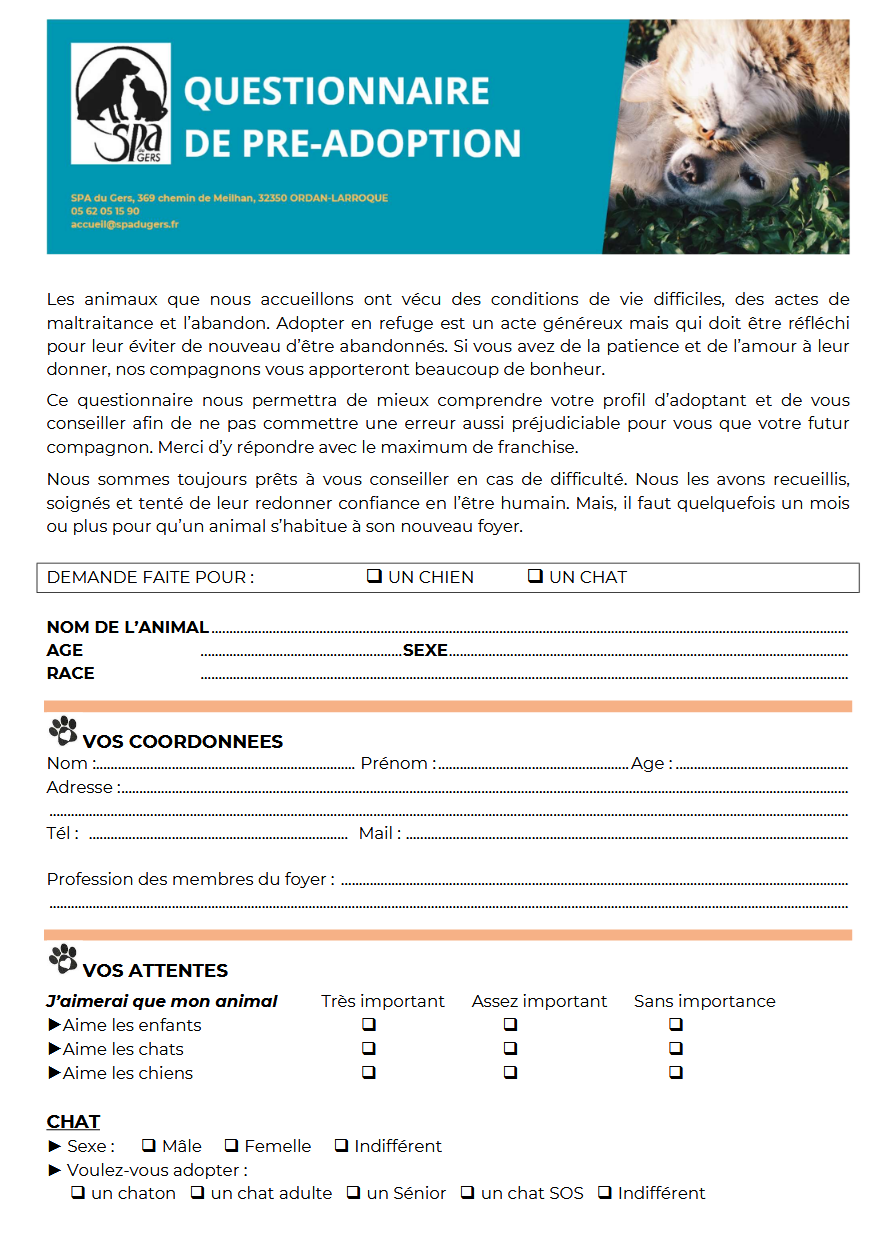 Depuis le 1er octobre 2022, pour toute adoption d’un animal, nous devons vous demander de présenter votre certificat d’engagement et de connaissance : le futur propriétaire devra prendre connaissance des besoins physiologiques, psychiques et comportementaux de son futur animal et signer ce certificat 7 jours avant son acquisition. Ceci est une obligation légale afin de faire prendre conscience aux familles de l’engagement à accueillir un animal. Mais pas d’inquiétude, nos soigneurs sont titulaires de l’ACACED et sont donc qualifiés pour vous le présenter, répondre à vos questions et valider votre certificat !