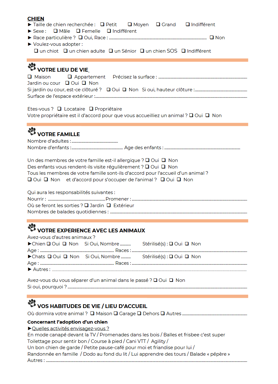 Être le propriétaire d’un animal est un grand bonheur, mais aussi une responsabilité, nous recherchons un foyer idéal pour chacun de nos pensionnaires, si les conditions pour son bien-être ne sont pas réunies, nous vous guiderons vers un animal plus adapté à votre mode de vie.